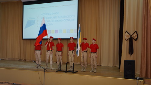 Открытие совещания началось с торжественного выноса флага Российской Федерации и флага муниципального образования Беляевский район юнармейским отрядом.